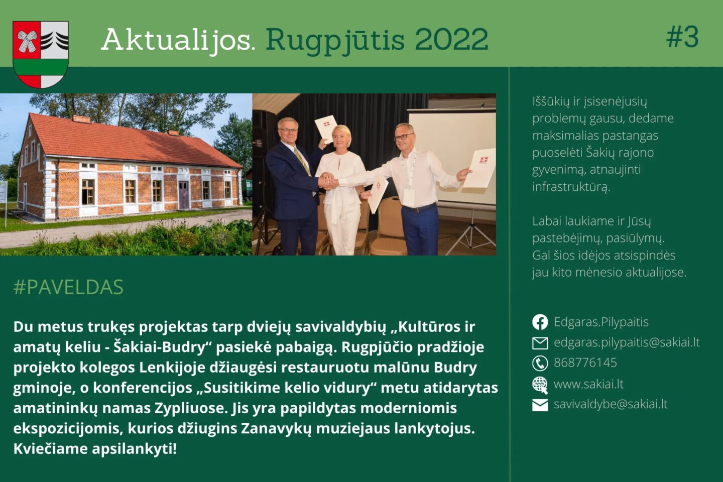 Šakių rajono savivaldybės meras Edgaras Pilyapitis ir Šakių rajono savivaldybė supažindina gyventojus su rugpjūčio mėnesio veiklos ataskaita.